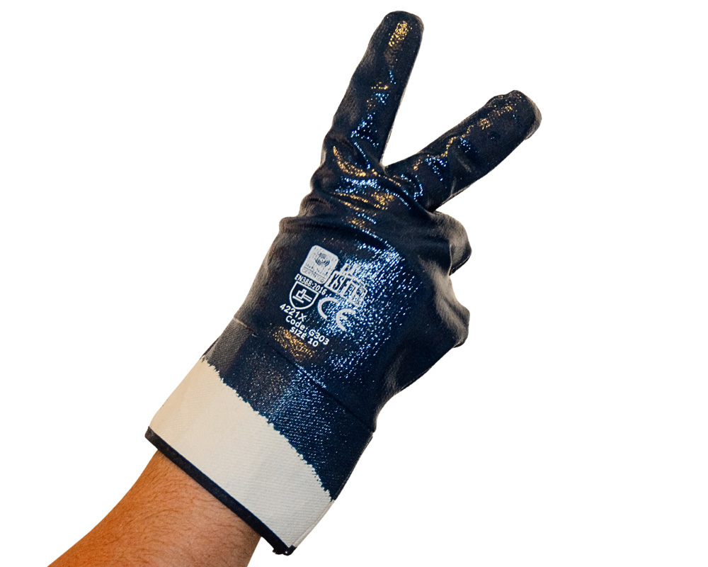 Blue Nitrile Dipped Gloves are excellent for a range of applications, including working with wet and oily objects or instruments, garbage collection and sorting, steel handling and construction, and fuel handling. Made from a jersey cotton lining for a cool feeling, and finished with heavy duty full dipped blue nitrile, they provide maximum abrasion protection (Level 4) and an EN388 rating of 4221X with extra protection against cut and tear.